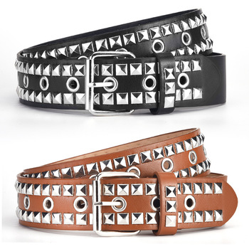 캐주얼 스타일 블랙 펑크 가죽 스터드 벨트 청바지 용 PU 가죽 핀 버클 합금 버클이있는 두 줄 피라미드 리벳 벨트